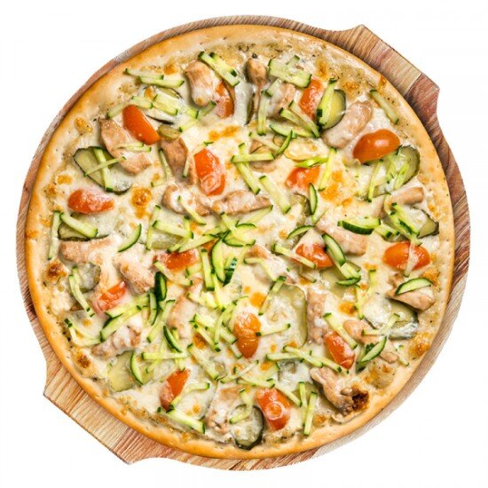Тесто, соус, моцарелла, куриная грудка, айсберг, листья салата, черри, пармезан, лимон. 1/655г (Энергетическая ценность в 100 гр.: ккал/кДж 198,6/830,9 белки 10,3г, жиры 6,2г, углеводы 25,5г)