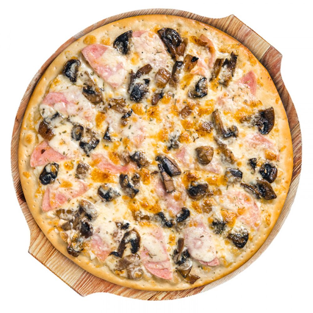 Тесто, соус, грибы вешенки,грибы шампиньоны, ветчина, моцарелла, масло оливковое, лук, специи. 1/720г (Энергетическая ценность в 100 гр.: ккал/кДж 212,93/891 белки 7,73г, жиры 9,32г, углеводы 25,82г)