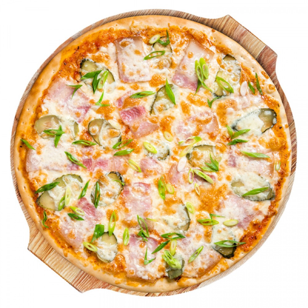 Тесто, соус, бекон, моцарелла, огурцы соленые, лук зеленый, масло оливковое. 1/670г (Энергетическая ценность в 100 гр.: ккал/кДж 261,4/1117,5 белки 8,2г, жиры 14,8г, углеводы 22,4г)