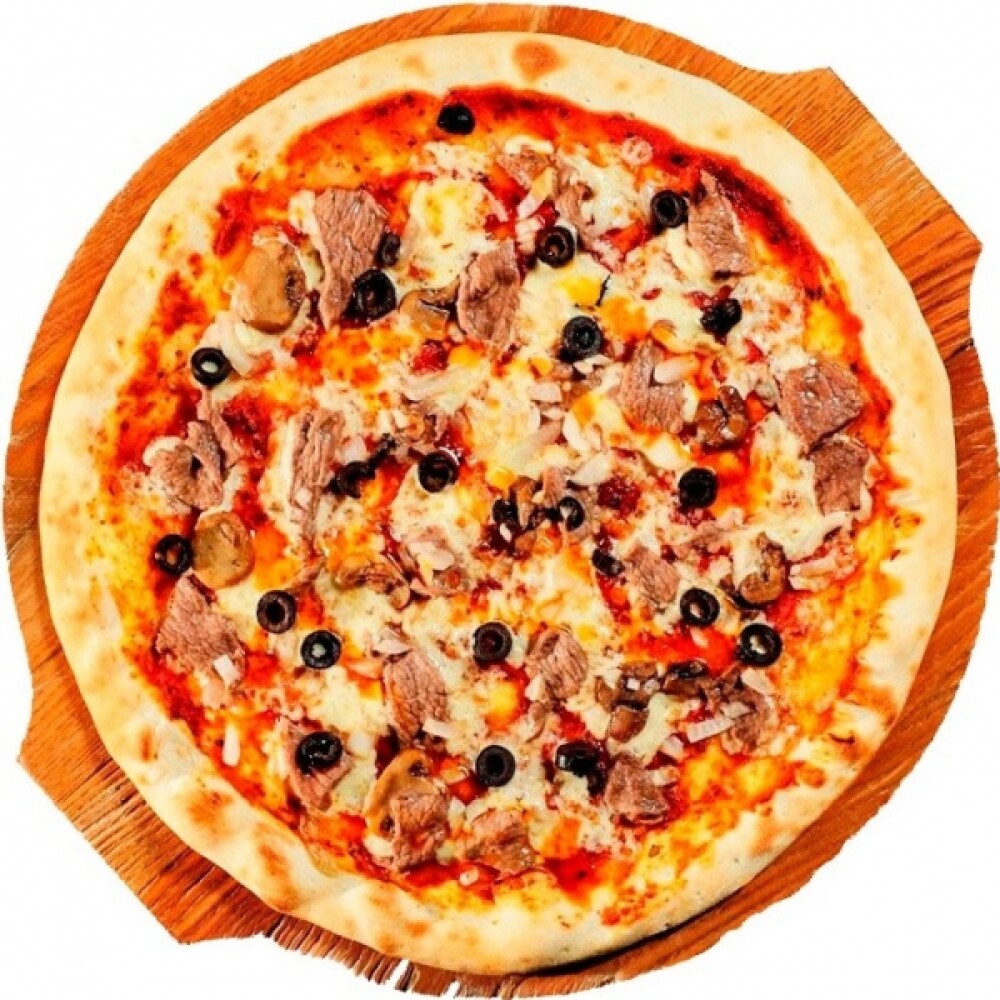 Тесто, соус, моцарелла, говядина, шампиньоны, маслины, лук репчатый. 1/600г (Энергетическая ценность в 100 гр.: ккал/кДж 202/845,1 белки 10,4г, жиры 6,9г, углеводы 24,5г)