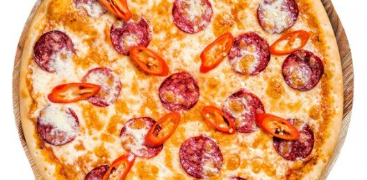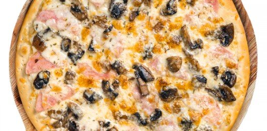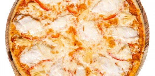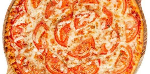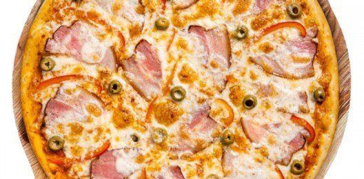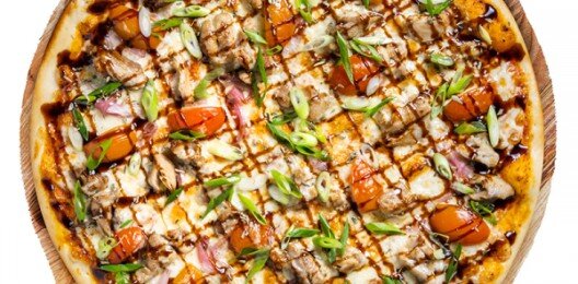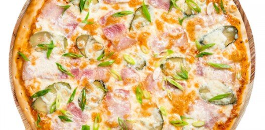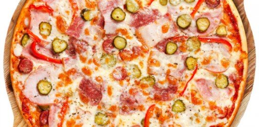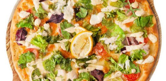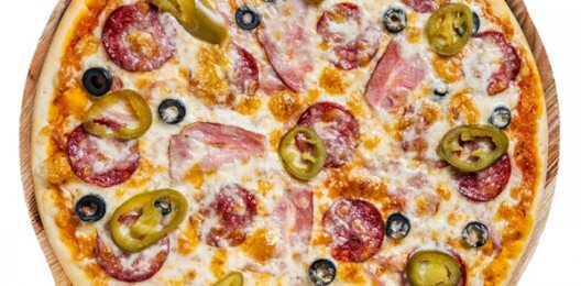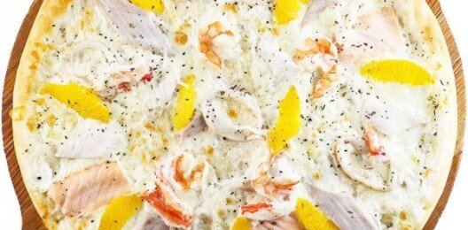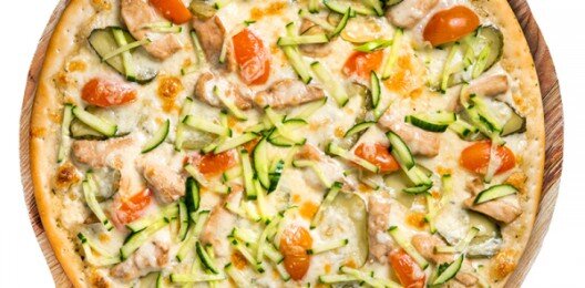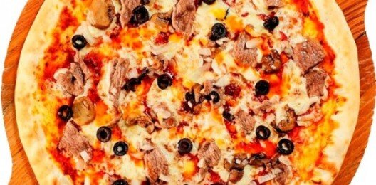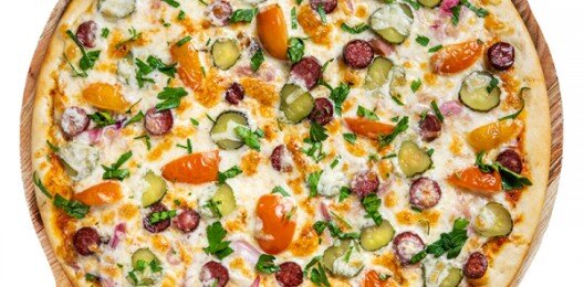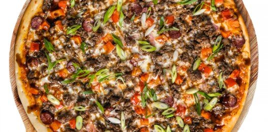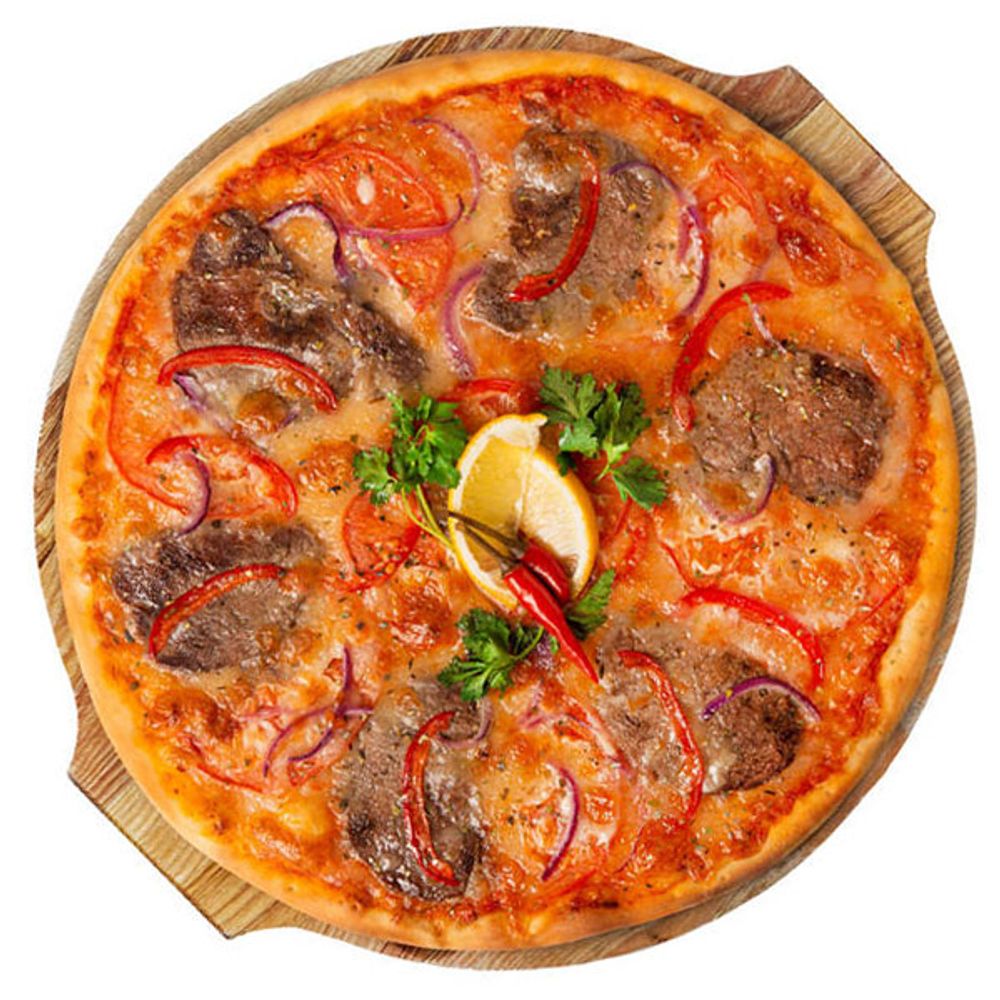 Тесто, соус, моцарелла, говядина мраморная, помидоры, лук репчатый, зелень, лимон, орегано, перец болгарский.