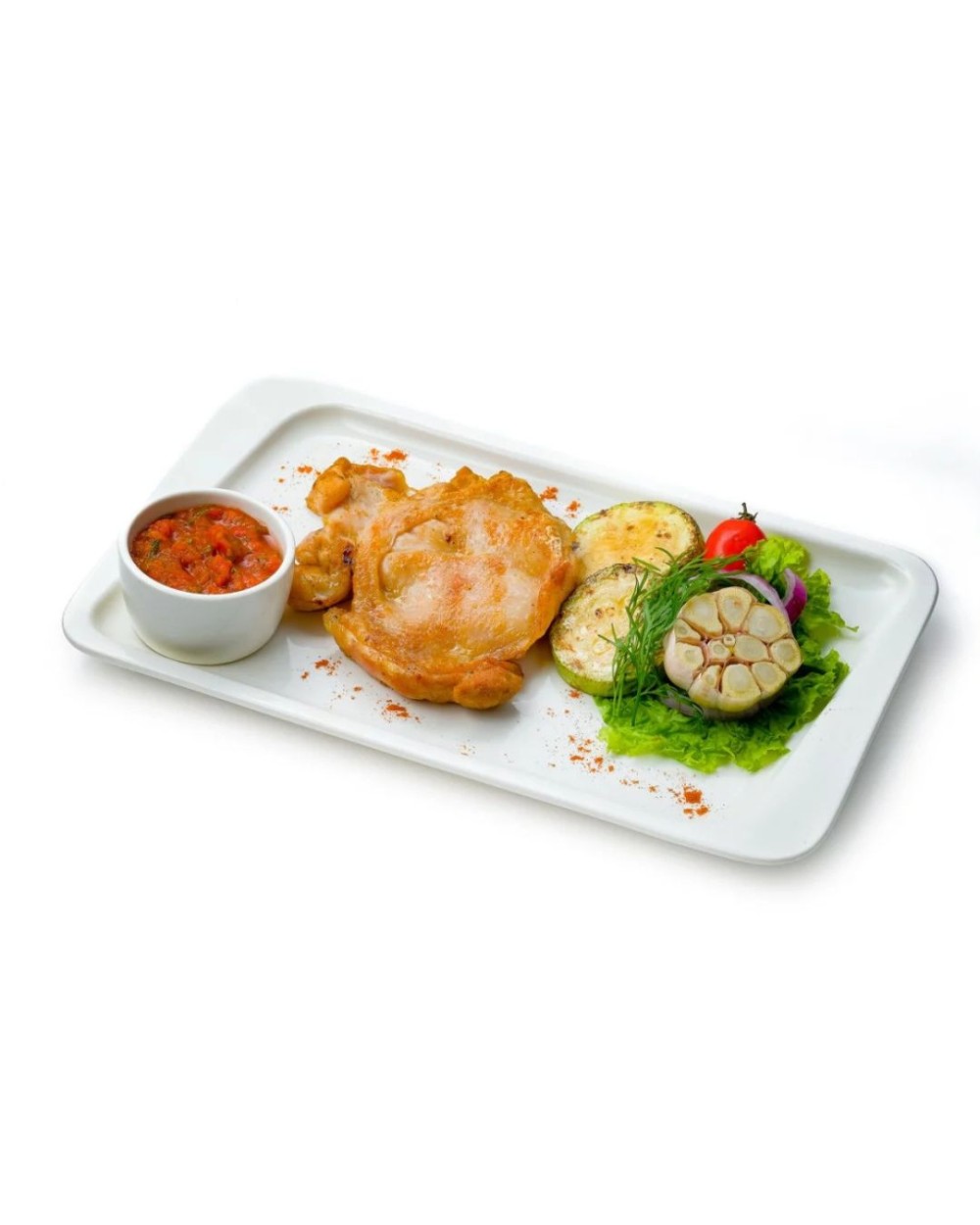 Куриное бедро, паприка, перец, лук, лист салата, кабачки, помидоры черри (Энергетическая ценность в 100 гр.: ккал/кДж 320/1018 белки 20 г, жиры 24 г, углеводы 0,5 г)