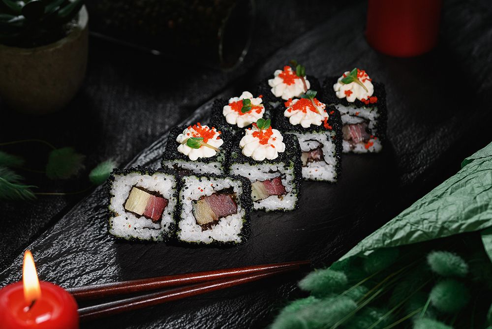 Рис, тобико, филе тунца, ананас сладкий, творожный сыр, нори. 1/220г (Энергетическая ценность в 100 гр.: ккал/кДж 278/1165, белки 14,9г, жиры 10,6г, углеводы 30,7г)