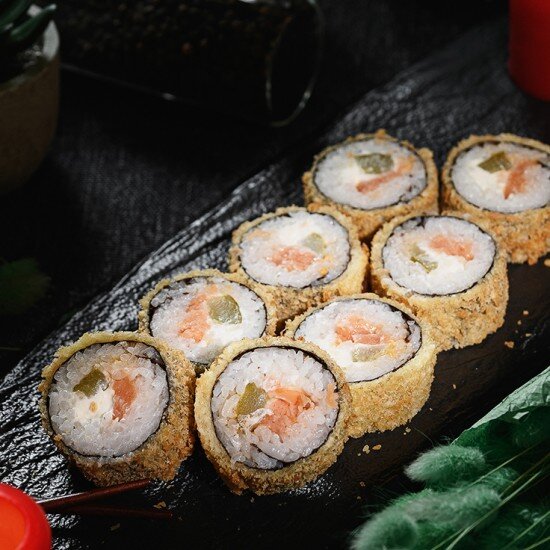 рис, кляр, сухари, филе гребешка, сыр творожный, огурцы свежие, лимон, нори 1/250г ккал/кДж 752/3150, белки 15,2г, жиры 51,5г, углеводы 57г