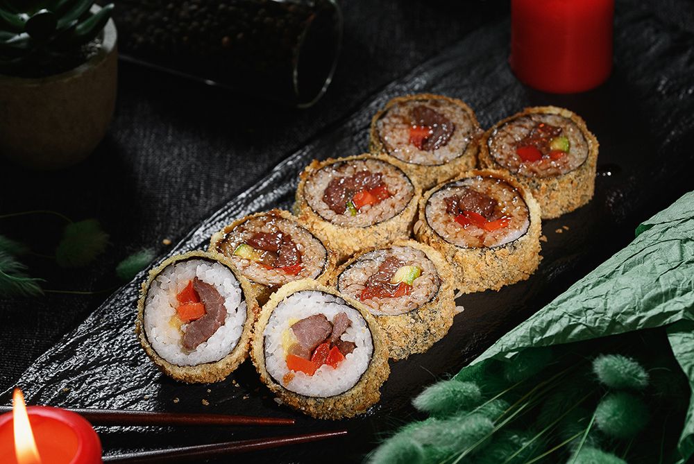 Рис, говядина, кляр, соус устричный, перец болгарский, морковь, кабачки, нории. 1/260г (Энергетическая ценность в 100 гр.: ккал/кДж 618/2586, белки 16,8г, жиры 43,2г, углеводы 40,3г)