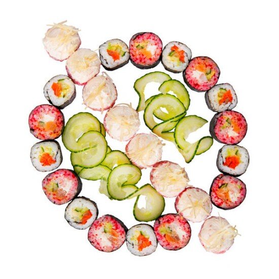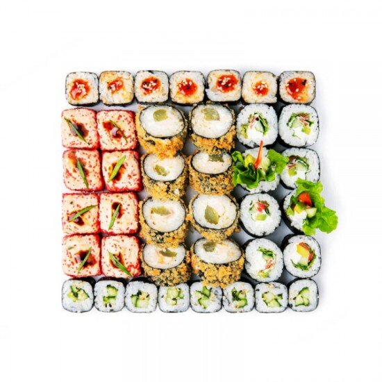 Ролл «Калифорния» ролл «Филадельфия» ролл «Ясай» ролл «Аляска» ролл «Острый лосось» соевый соус, васаби.