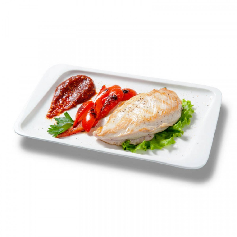 маринованная куриная грудка, перец болгарский, чеснок, лист салата, соус пикантный. 1/310г (Энергетическая ценность в 100 гр.: ккал/Кдж 357/1496 белки 51г, жиры 12,5г, углеводы 10,3г