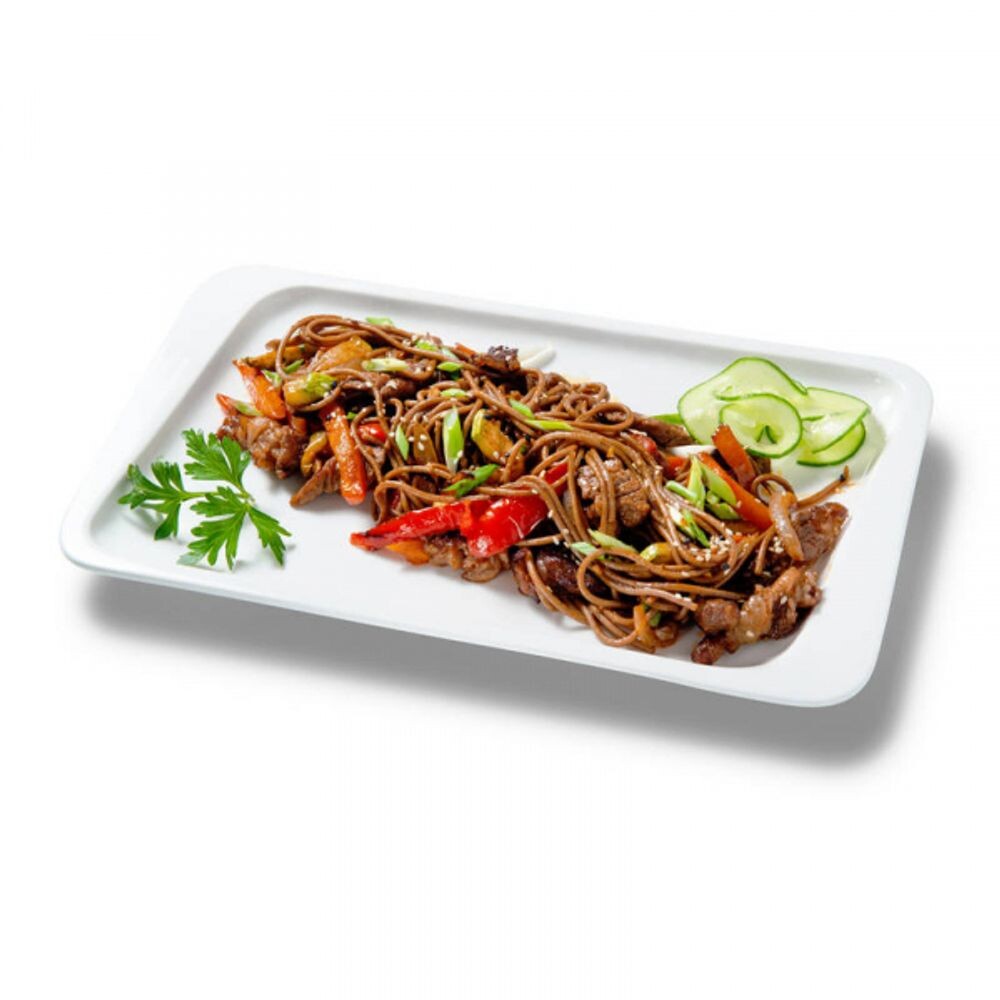 Говядина, лук зеленый, лапша гречневая, соус пикантный, кунжут, соевый соус, морковь, перец болгарский. 1/310г (Энергетическая ценность в 100 гр.: ккал/Кдж 112/469 белки 7,13 г, жиры 4,54 г, углеводы 10,94 г)