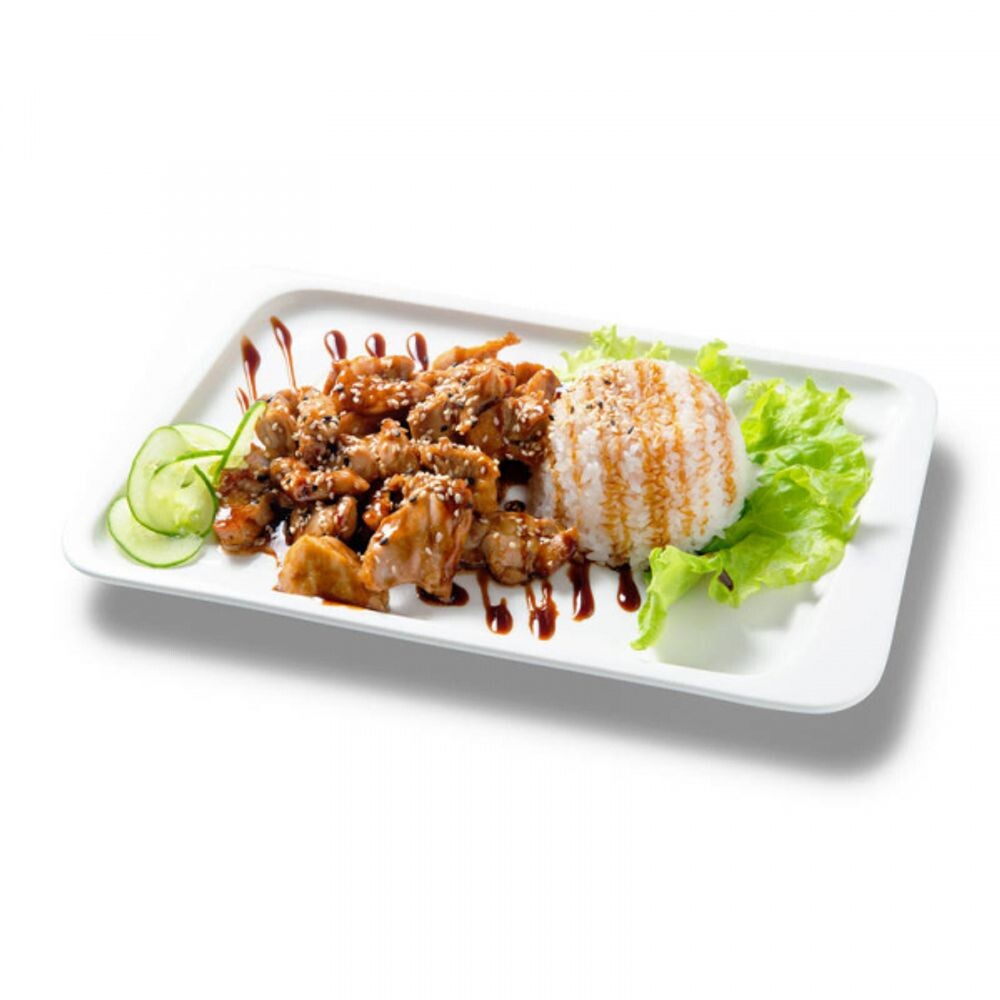Куриное филе, рис, соус терияки, огурцы свежие, салат листовой, лимон, кунжут. 1/310г (Энергетическая ценность в 100 гр.: ккал/Кдж 249/843 белки 25,8г, жиры 10г, углеводы 11,6г)