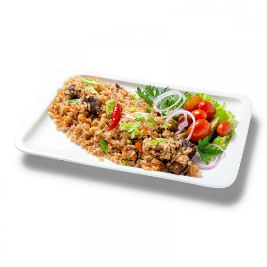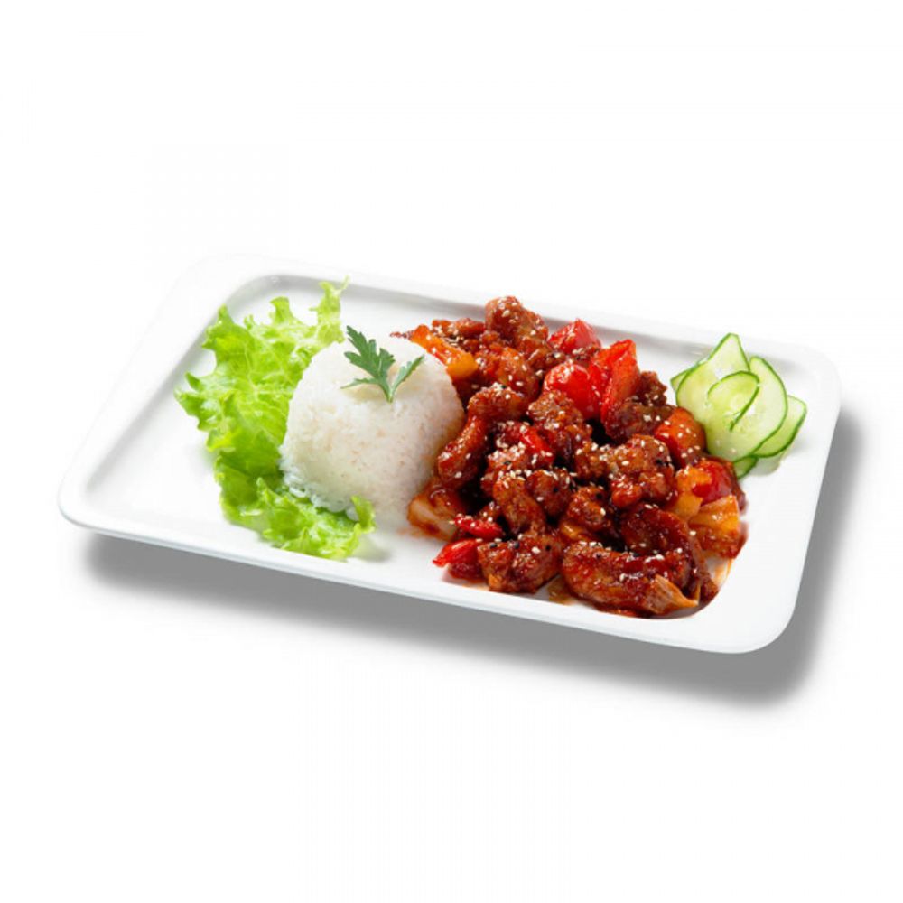 Куриное филе, перец болгарский, лук репчатый, ананас консервированный, рис отварной, кунжут, соус кисло-сладкий, лист салата.