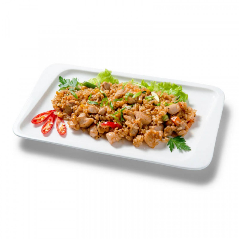Рис, соус пикантный, смесь овощная мексиканская, куриное филе, специи мексиканские, лист салата, лук репчатый, лук зеленый, перец халапеньо.