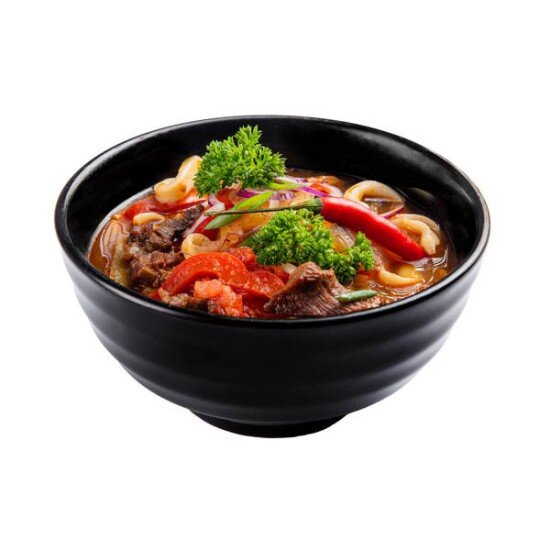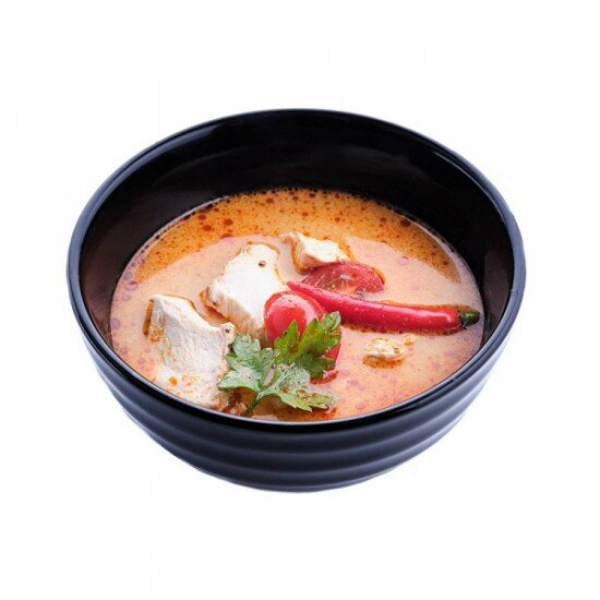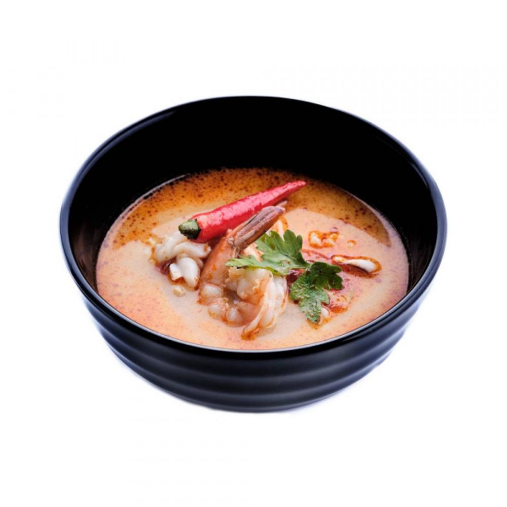 Рыбный бульон, том-ям паста, кокосовое молоко, черри, грибы шиитаки, кальмар, кунжут, мидии, гребешок, креветка тигровая, перец чили, зелень петрушка.