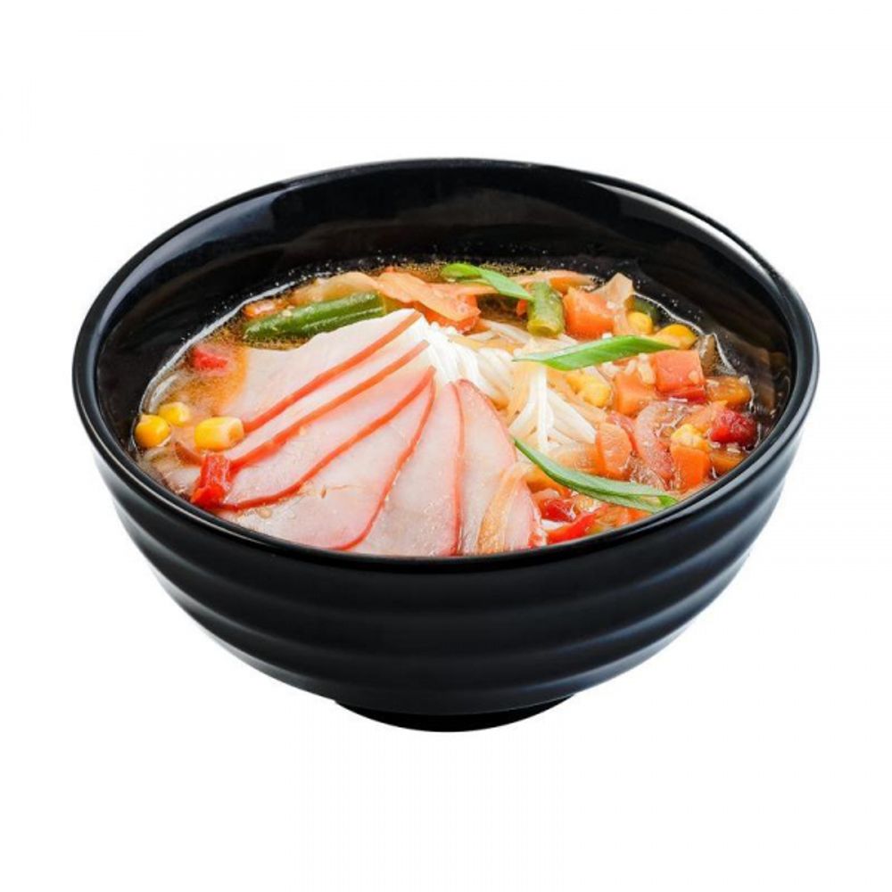 Лапша рамен, карбонат, яйца куриные, лук зеленый, морковь, мисо-паста, имбирь, бульон говяжий, соус соевый, кунжут, лук репчатый. 1/420г (Энергетическая ценность в 100 гр.: ккал/Кдж 371/1551 белки 9,4г, жиры 33,2г, углеводы 8,7г)