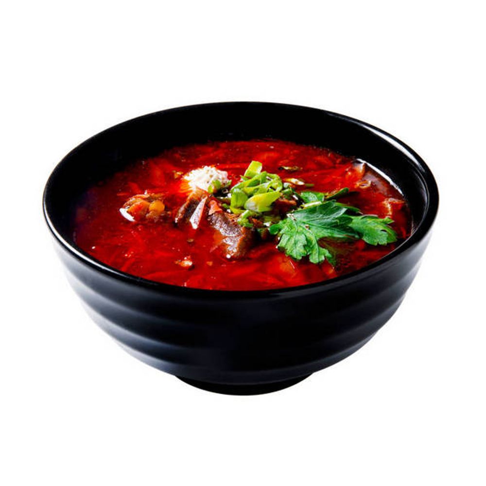 Говядина, капуста, морковь, лук репчатый, картофель, перец сладкий болгарский, зелень (укроп, петрушка, лук), чеснок, свекла, специи, сало соленое, хлеб, сметана.